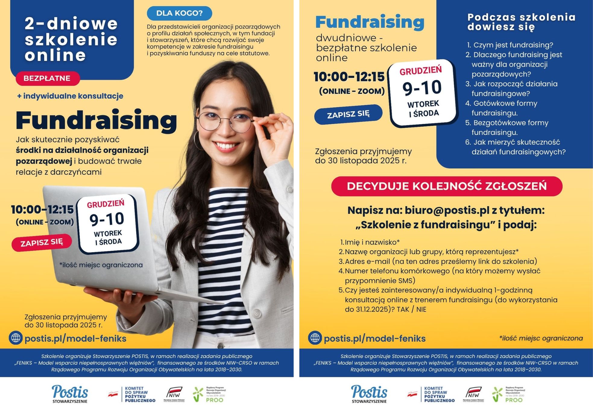Uczestnicy szkolenia otrzymują możliwość skorzystania z 1 godziny indywidualnych konsultacji online z trenerem fundraisingu, do wykorzystania do końca grudnia 2025 r.